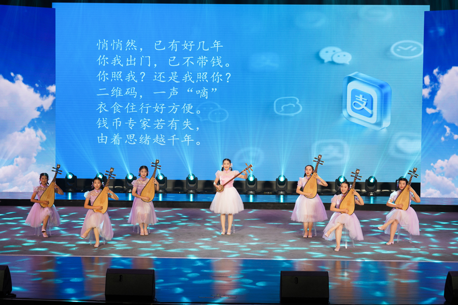 从如今电子支付的便捷方式说起,引出最早使用“贝币”的智慧……上海市姚连生中学带来的评弹《小小钱币》,以细腻婉转的唱腔,展现了江南曲艺的独特韵味。金山区朱行小学带来沪剧《江姐·五洲人民齐欢笑》,字正腔圆的演唱传递出革命先烈的崇高精神。朱行小学沪剧班成立已近5年,是学校“戏曲进校园”重点项目。依托专业院团,沪剧班系统训练学员发音、唱腔等技能,2024年荣获上海市“雏鹰杯”红领巾中华文化达人挑战赛一等奖,多次获得上海市“小白玉兰优秀集体节目”称号,连续四年斩获中国少儿戏曲“小梅花优秀集体奖”。