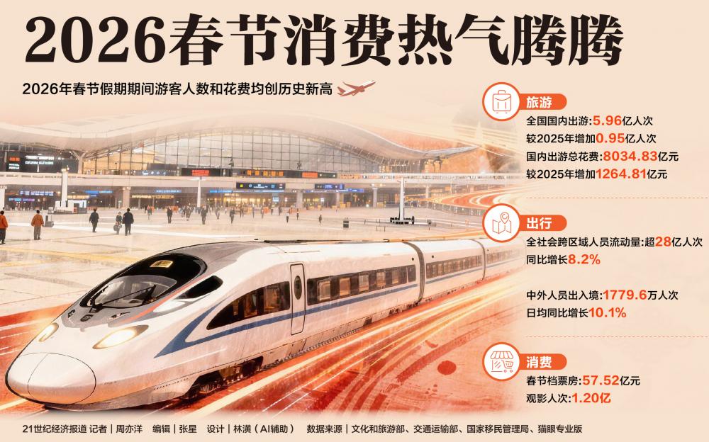 文化和旅游部数据显示,春节假日9天,全国国内出游5.96亿人次,较2025年春节假日8天增加0.95亿人次;国内出游总花费8034.83亿元,较2025年春节假日8天增加1264.81亿元。