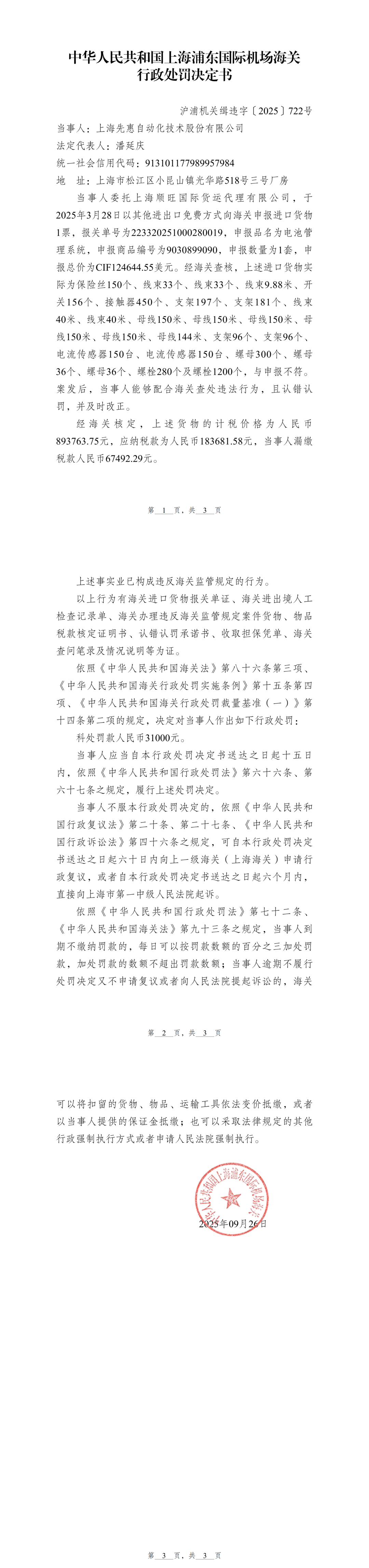 近日河南配资网,中华人民共和国上海浦东国际机场海关发布关于上海先惠自动化技术股份有限公司违反海关监管规定行政处罚决定书(沪浦机关缉违字〔2025〕722号)。