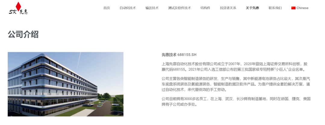 上海先惠自动化技术股份有限公司成立于2007年,2020年登陆上海证券交易所科创板,股票代码688155。2021年公司入选工信部公布的第三批国家级专精特新“小巨人”企业名单。
